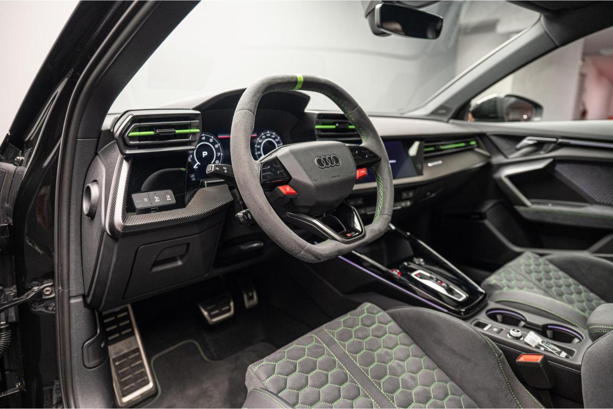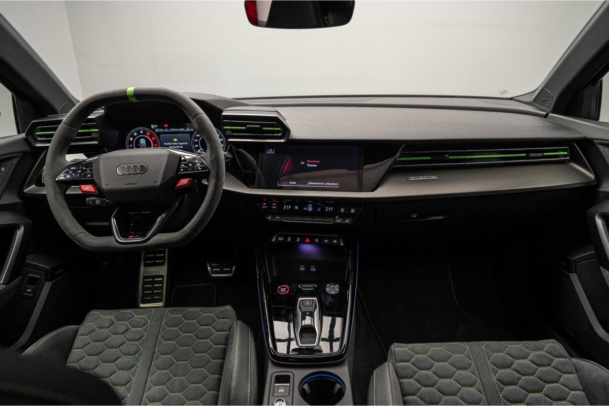 2.5 TFSI 400 S tronic 7 QUATTRO, essence, noir, 15/04/2025, Audi phone box, Augmentation de la vitesse maximale à 280 km/h Limitation éléctronique, Becquet AR en Carbone, Boitiers de rétrovseurs extérieurs dans la couleur de la carosserie, Eléments de l’habitacle intérieur en microfibre Dinamica composé de/ Accoudoir central AV en microfibre Dinamica, Accoudoir de porte en microfibre Dinamica, Equipement extérieur RS en Noir Brillant, Fixations pour sièges enfants ISOFIX AV, Freins en acier RS avec étriers de frein en rouge avec inscription RS à l’AV, Insert décoratif et surfaces accentuées en Carbone Atlas Mat (au tableau de bord), Jantes style à 10 branches en Y gris platine, tournées brillantes 9, 0Jx 19pneus 265/30 AV, 0, 0Jx 19pneus 245/35 AR, Pack assistance route Système de protectionproactive des occupants à l’AV, sur les cotés et à l’AR, Avertisseurs de changement de voie avec avertissement d’ouverture de porte et assistant de circulation transversale, Pack climatisation plus – Sièges AV chauffants- Climatisation confort automatique 3 zones, Pack Navigation Affichage tête haute, MMI Navigation plus avec MMI touch, Audi virtual cokpit plus, Système audio Sonos premium avec son 3D, Pare-brise en vitrage athermique, Projecteurs Matrix LED, blocs de feux AR à LED et lave-projecteurs, Sellerie en microfibre Dinamica/cuir avec surpiqûres en nid d’abeille et monogramme RS, Sièges baquets, Suspension avec Amortisseurs pilotés, Système d’échappement sport RS, Teintes métalisées, Toit ouvrant panoramique