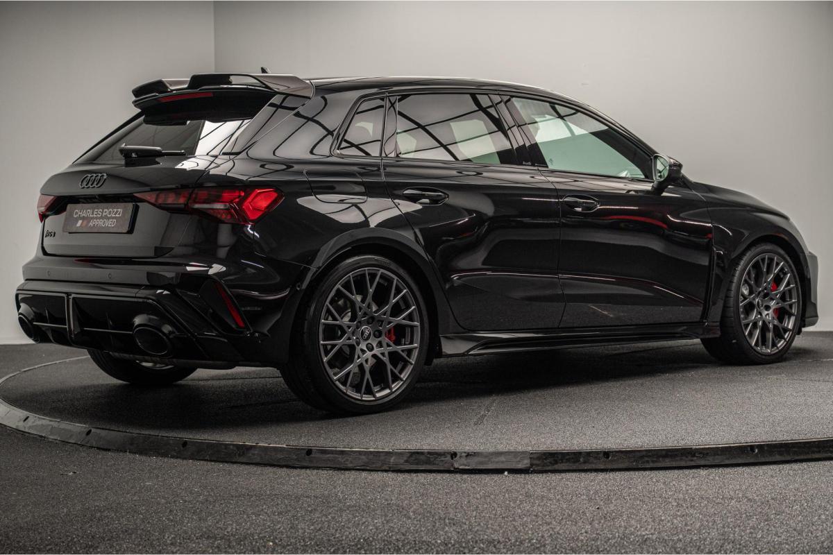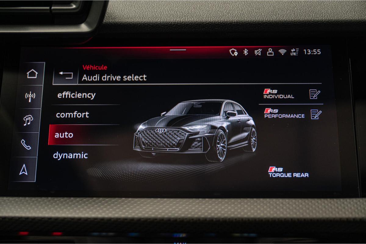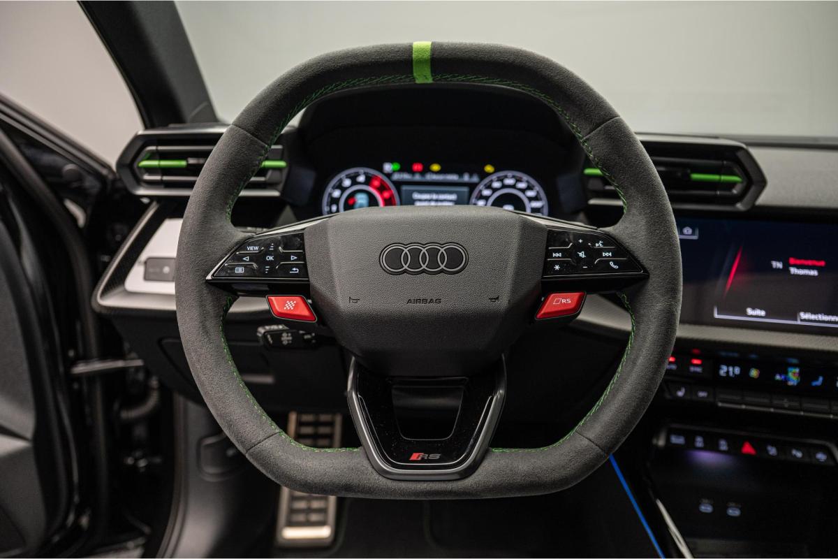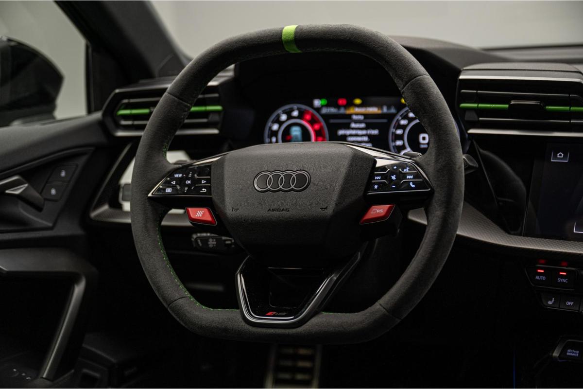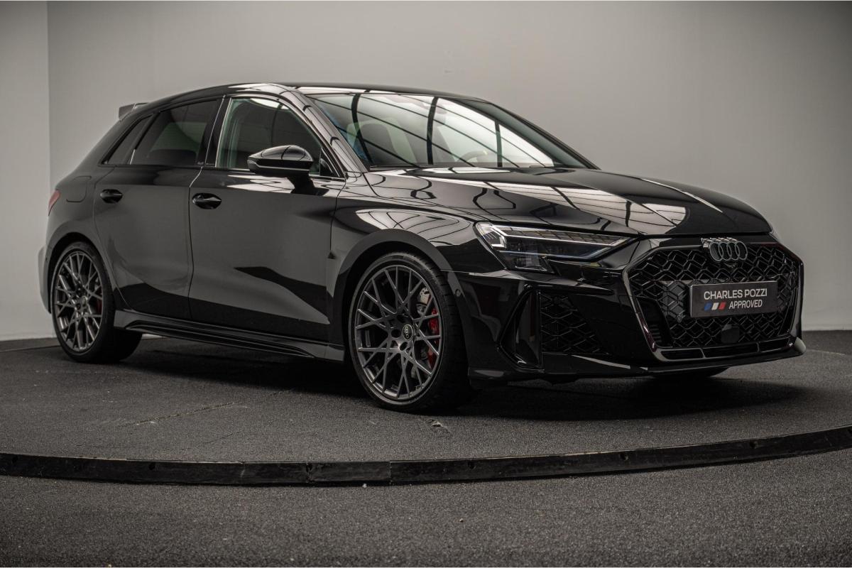 2.5 TFSI 400 S tronic 7 QUATTRO, essence, noir, 15/04/2025, Audi phone box, Augmentation de la vitesse maximale à 280 km/h Limitation éléctronique, Becquet AR en Carbone, Boitiers de rétrovseurs extérieurs dans la couleur de la carosserie, Eléments de l’habitacle intérieur en microfibre Dinamica composé de/ Accoudoir central AV en microfibre Dinamica, Accoudoir de porte en microfibre Dinamica, Equipement extérieur RS en Noir Brillant, Fixations pour sièges enfants ISOFIX AV, Freins en acier RS avec étriers de frein en rouge avec inscription RS à l’AV, Insert décoratif et surfaces accentuées en Carbone Atlas Mat (au tableau de bord), Jantes style à 10 branches en Y gris platine, tournées brillantes 9, 0Jx 19pneus 265/30 AV, 0, 0Jx 19pneus 245/35 AR, Pack assistance route Système de protectionproactive des occupants à l’AV, sur les cotés et à l’AR, Avertisseurs de changement de voie avec avertissement d’ouverture de porte et assistant de circulation transversale, Pack climatisation plus – Sièges AV chauffants- Climatisation confort automatique 3 zones, Pack Navigation Affichage tête haute, MMI Navigation plus avec MMI touch, Audi virtual cokpit plus, Système audio Sonos premium avec son 3D, Pare-brise en vitrage athermique, Projecteurs Matrix LED, blocs de feux AR à LED et lave-projecteurs, Sellerie en microfibre Dinamica/cuir avec surpiqûres en nid d’abeille et monogramme RS, Sièges baquets, Suspension avec Amortisseurs pilotés, Système d’échappement sport RS, Teintes métalisées, Toit ouvrant panoramique
