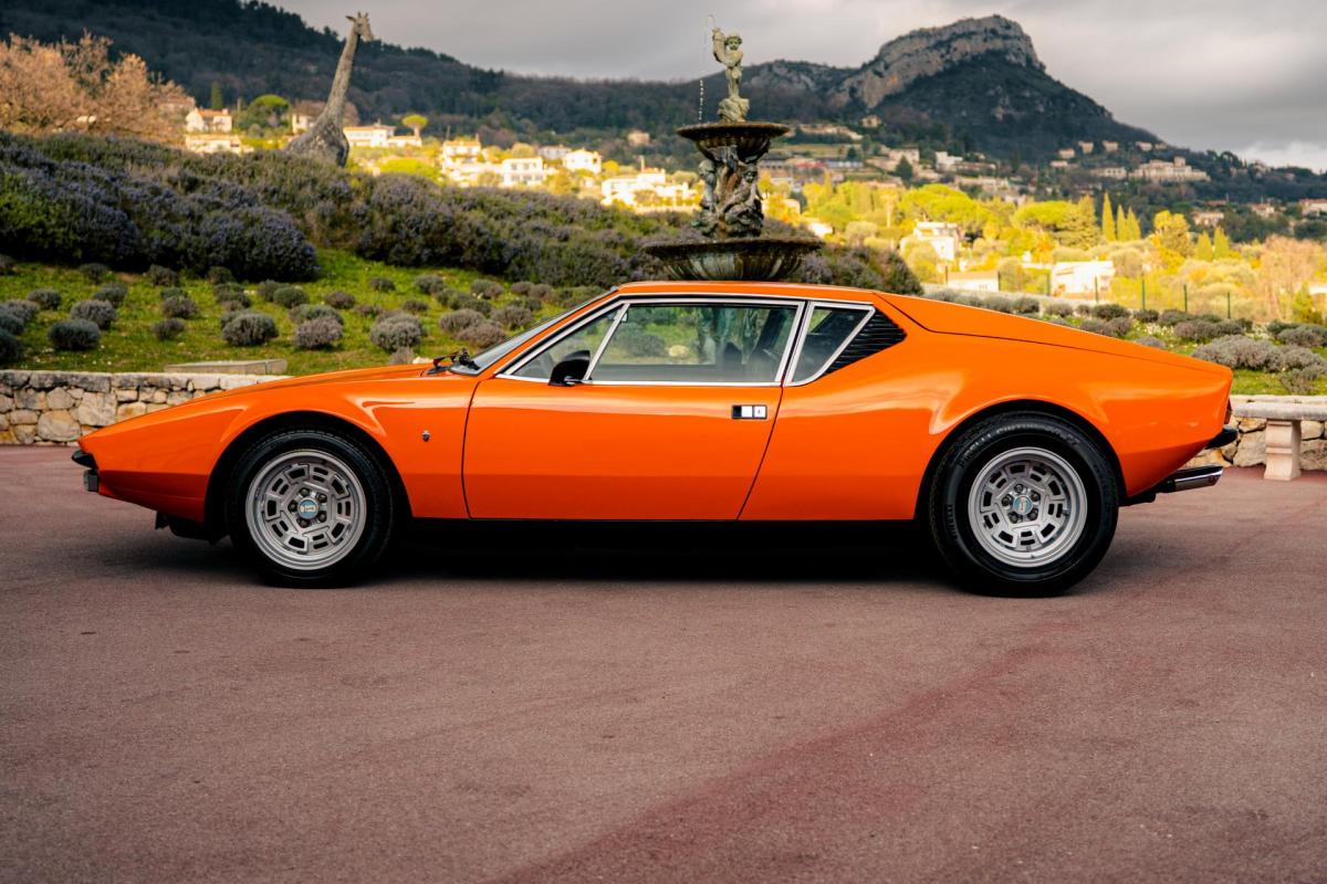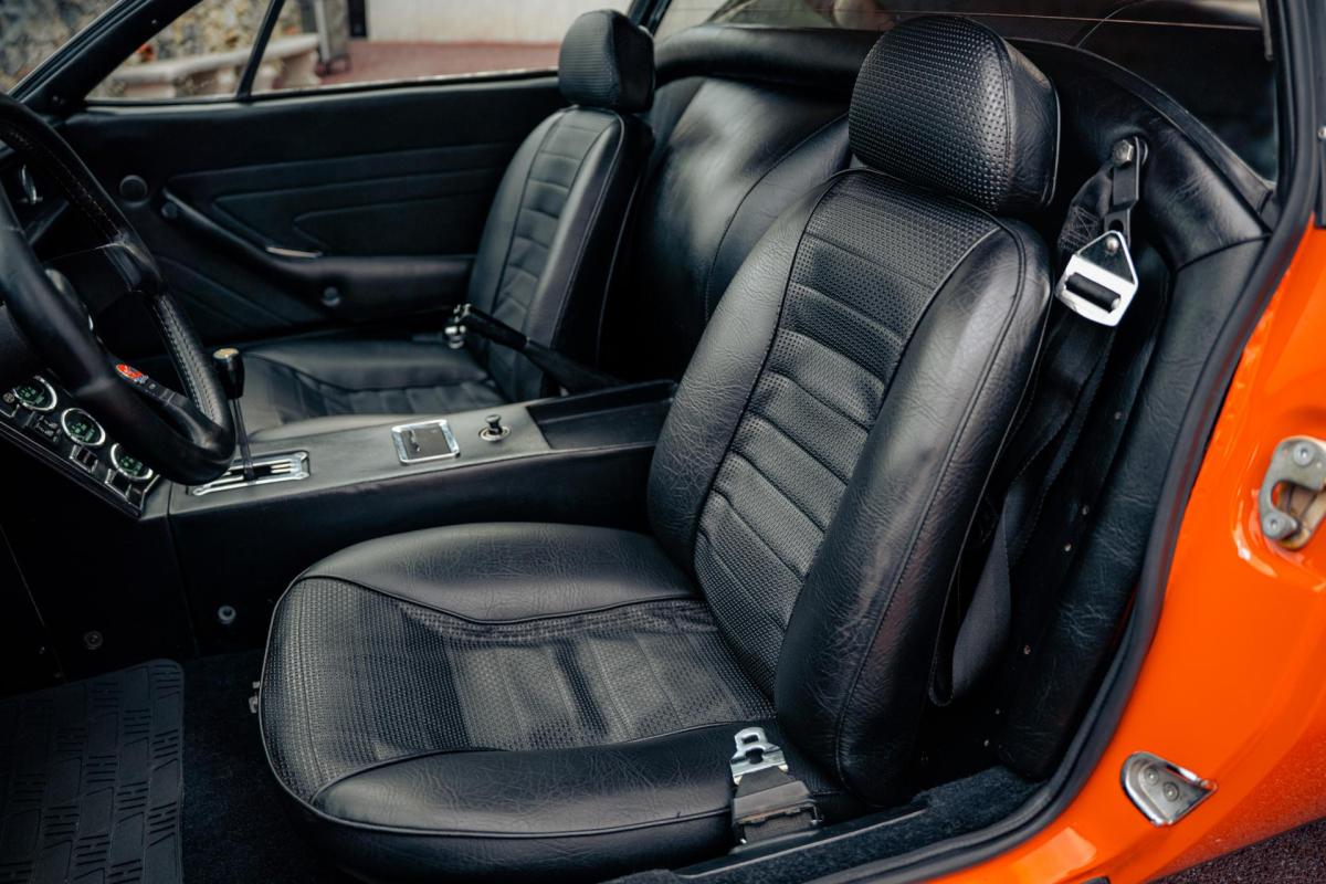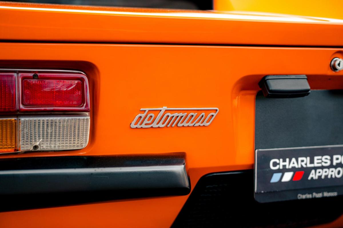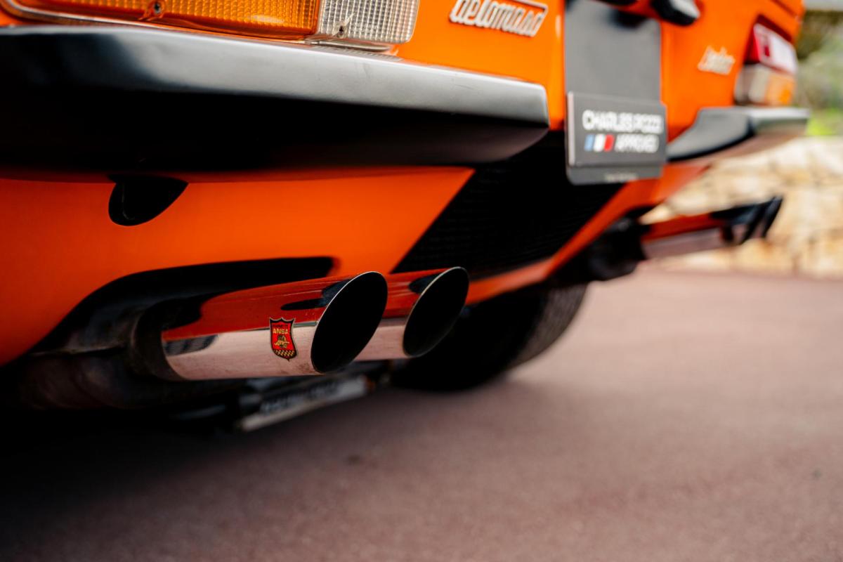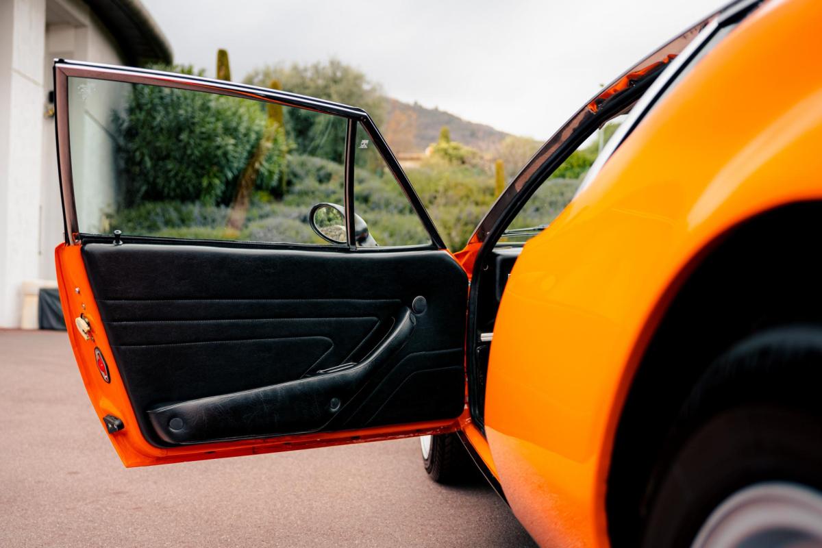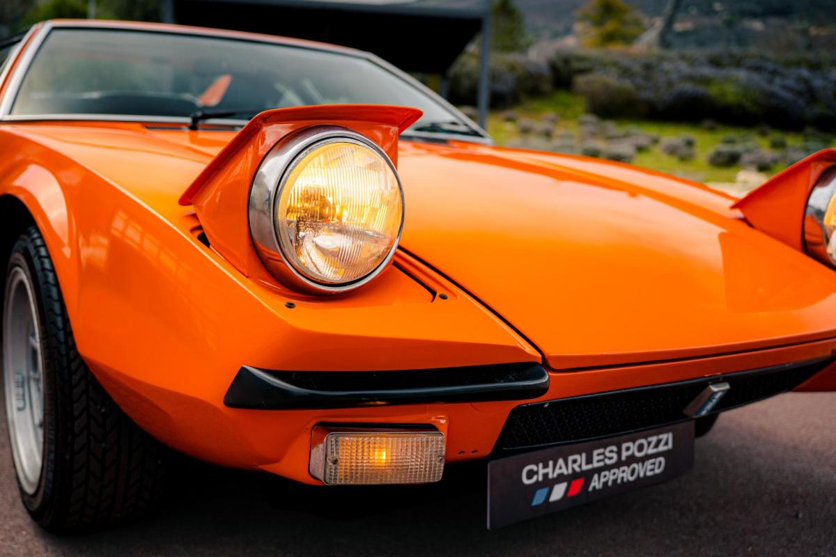 La De Tomaso Pantera est une sportive emblématique des années 70, associant design italien et mécanique américaine. Cet exemplaire de 1973 se distingue par sa teinte orange audacieuse et son intérieur noir, affichant un faible kilométrage de 13 100 km, rare pour un modèle de cette époque. Le V8 essence atmosphérique couplé à une boîte manuelle offre une expérience de conduite brute et authentique.