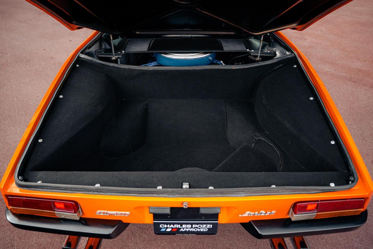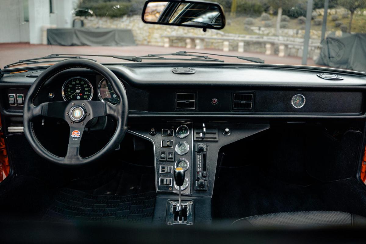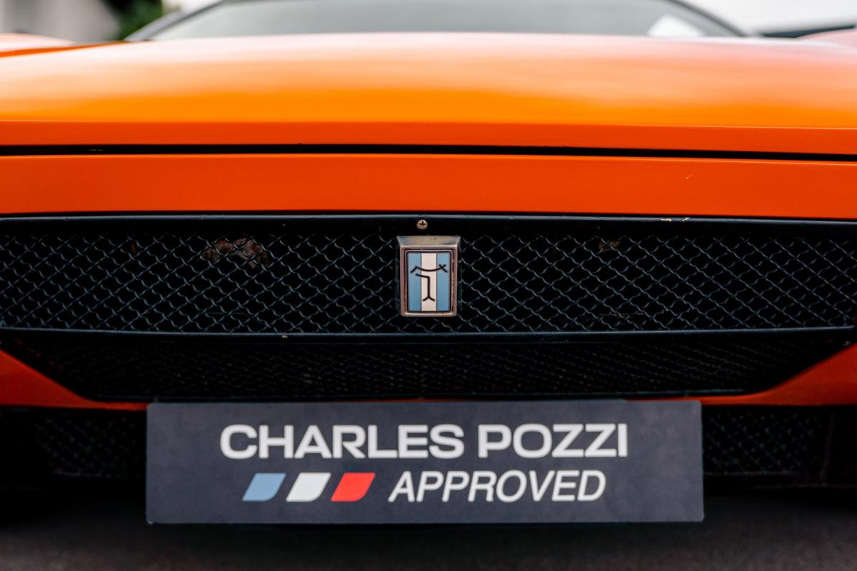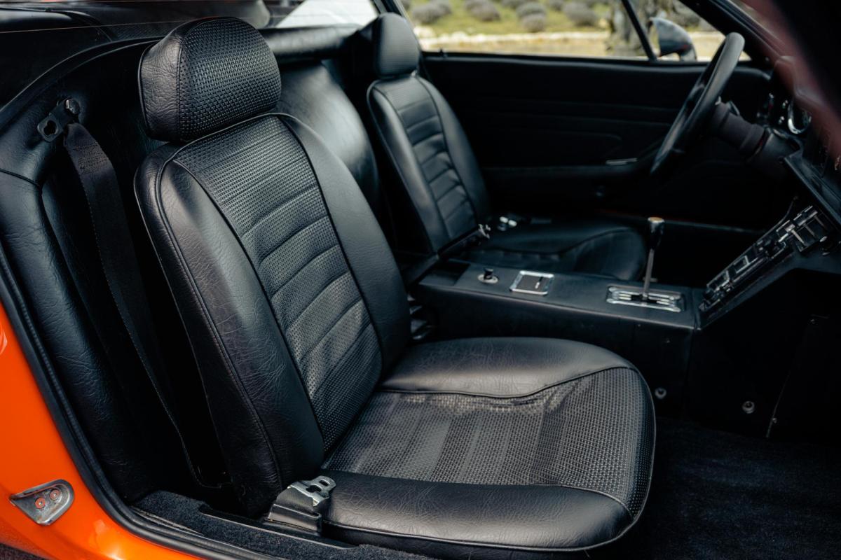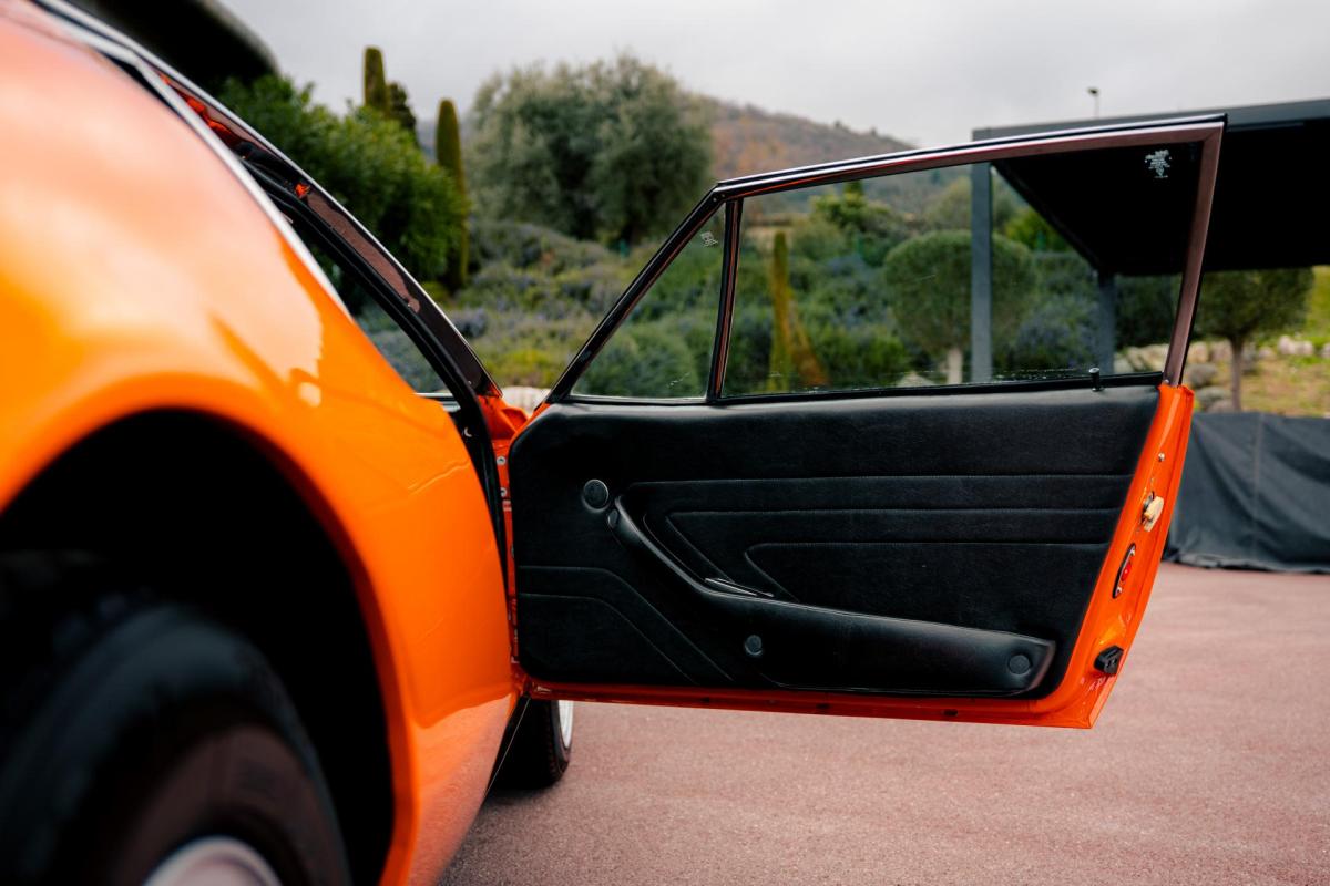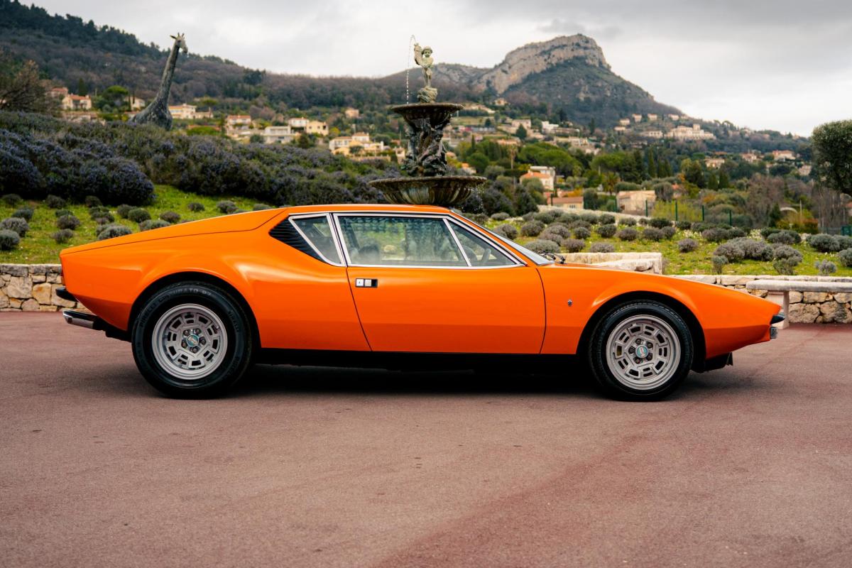 La De Tomaso Pantera est une sportive emblématique des années 70, associant design italien et mécanique américaine. Cet exemplaire de 1973 se distingue par sa teinte orange audacieuse et son intérieur noir, affichant un faible kilométrage de 13 100 km, rare pour un modèle de cette époque. Le V8 essence atmosphérique couplé à une boîte manuelle offre une expérience de conduite brute et authentique.