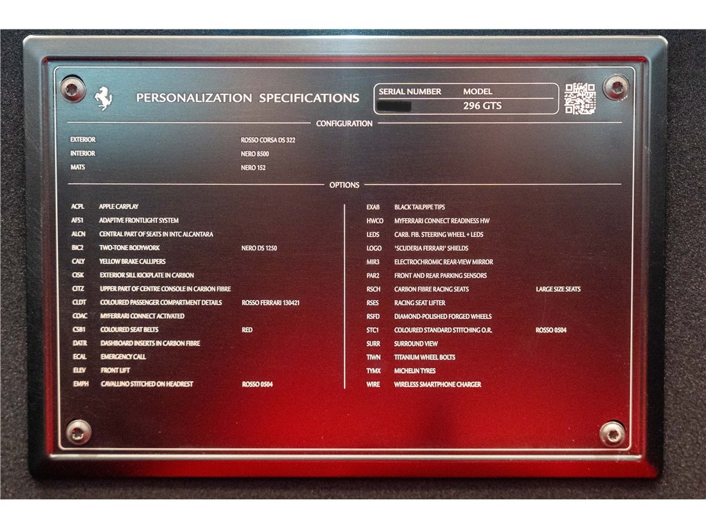 La Ferrari 296 GTS est animée par une motorisation V6 bi-turbo de 3,0 litres hybride rechargeable (PHEV) développant une puissance cumulée exceptionnelle de 830 chevaux. Ce modèle cabriolet présente son extérieur dans l’emblématique couleur Rosso Corsa, et propose deux places assises dans un habitacle sportif dont l’intérieur est de couleur Nero. La 296 GTS est un modèle clé car elle est le premier Spider V6 hybride de l’histoire de Ferrari, offrant des performances de pointe et le plaisir du moteur V6 à ciel ouvert, sans compromis sur l’aérodynamisme. De plus, Ferrari est le seul constructeur à proposer un programme de garantie hybride étendu couvrant le remplacement de la batterie haute tension, offrant une tranquillité d’esprit prolongée à ses propriétaires.