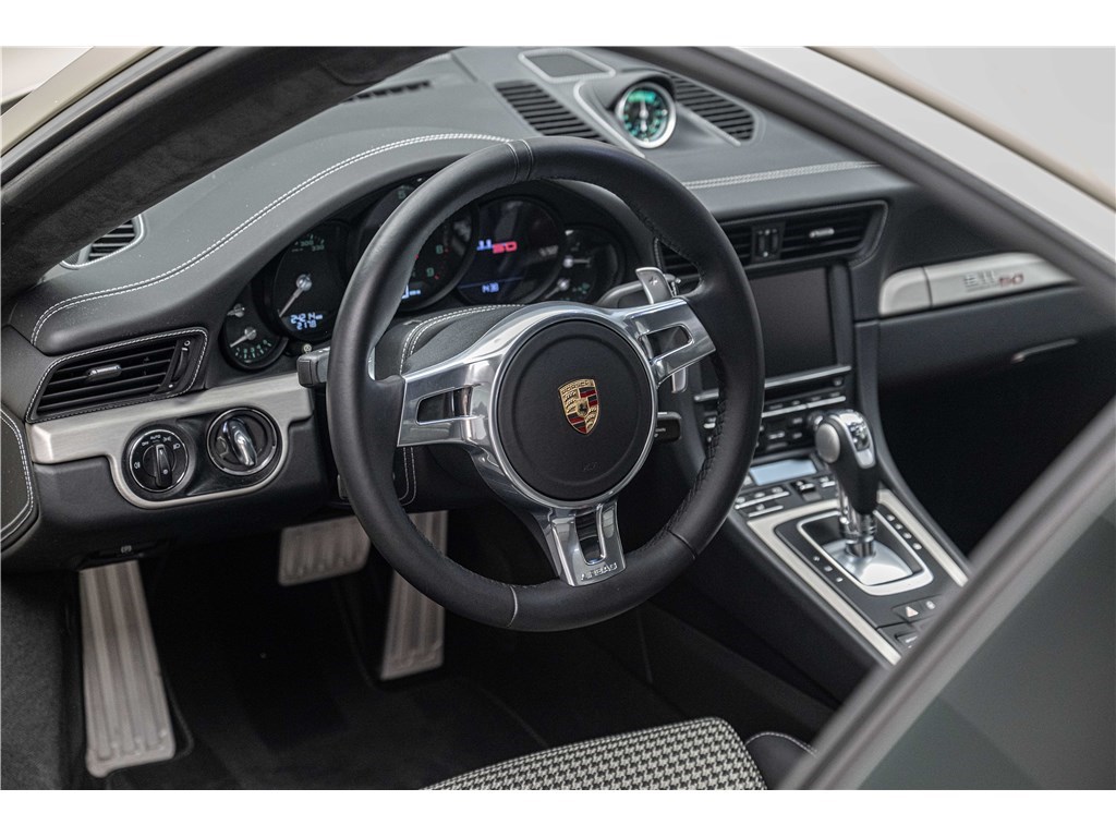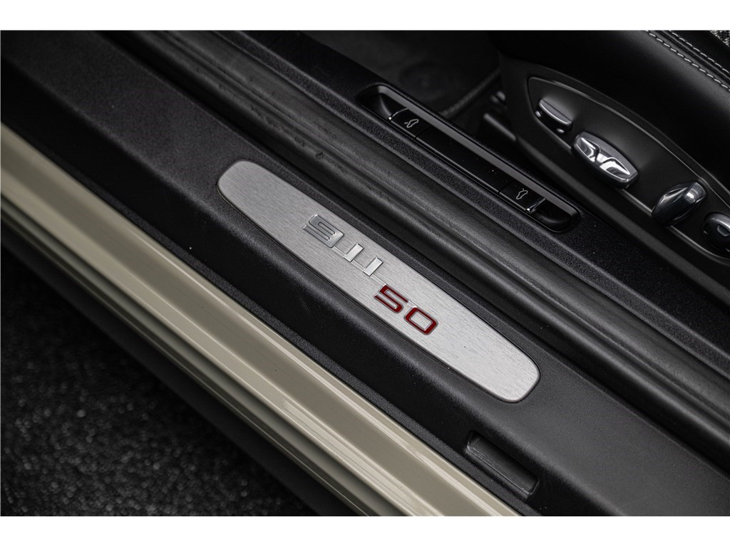 Coloris spécifique, jantes Fuchs 20’’, intérieur en cuir noir et tissu « Pepita », badges chromés « 911 50 », Pack Sport Chrono, échappement sport, PASM abaissé, et flat-6 de 400 ch couplé à la boîte PDK.