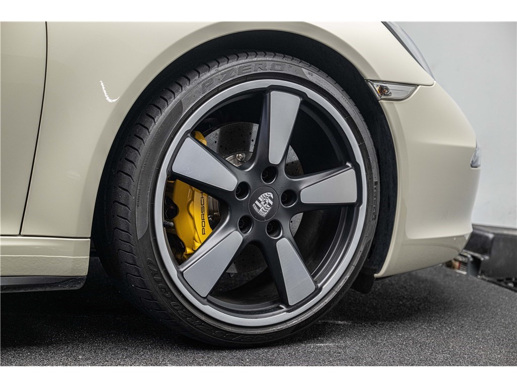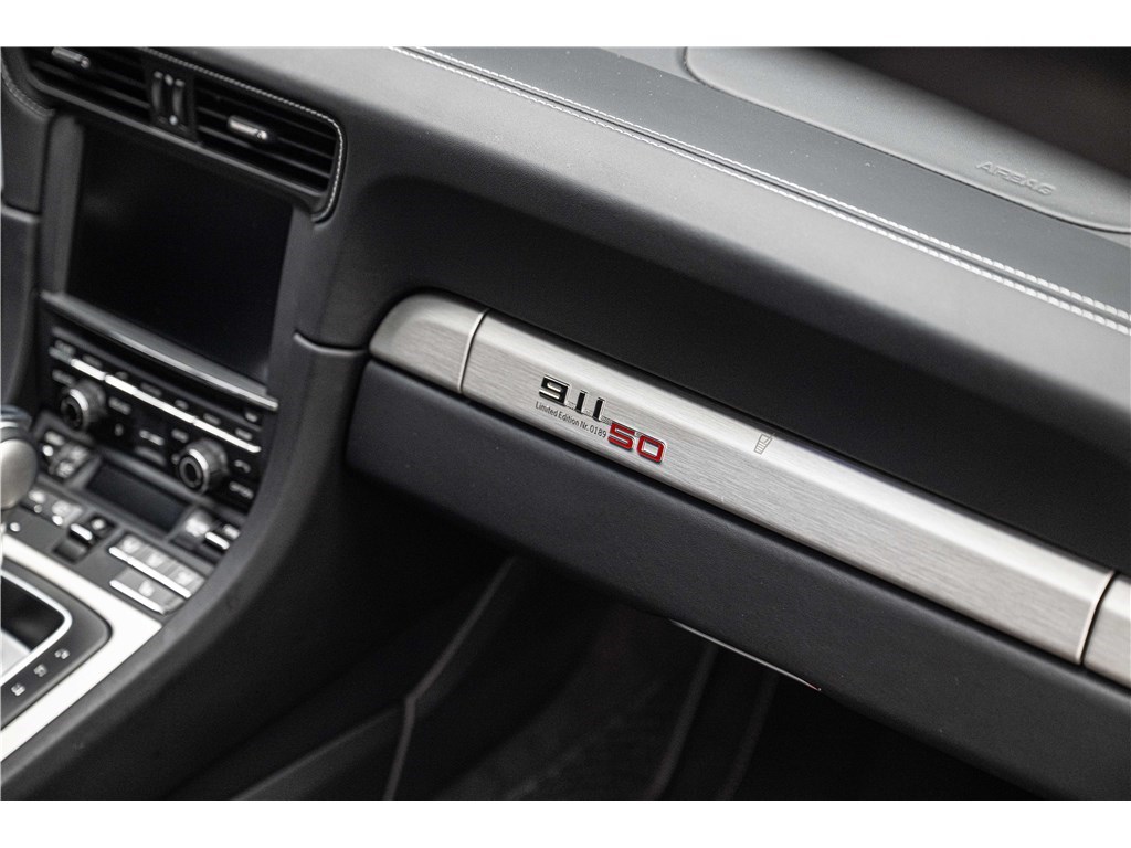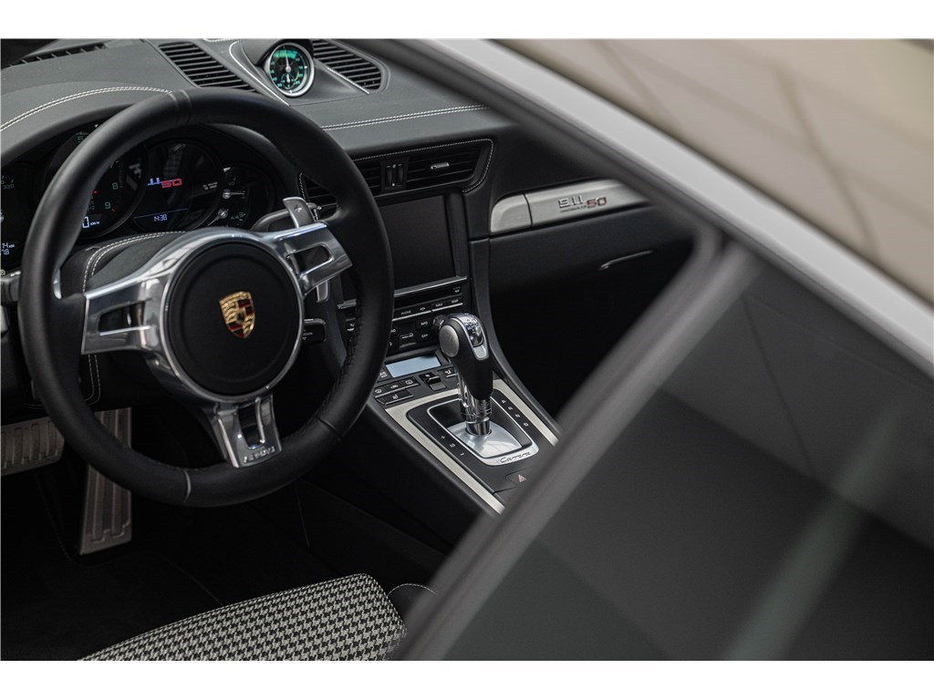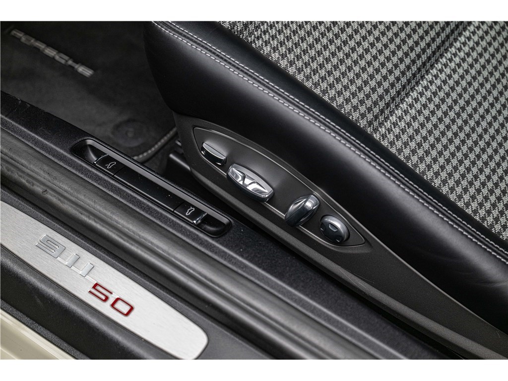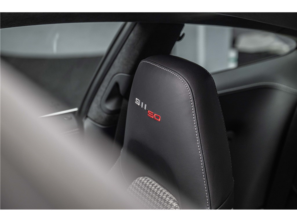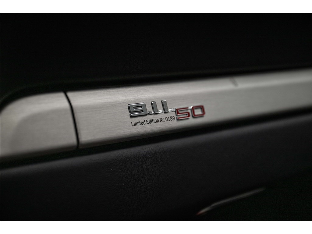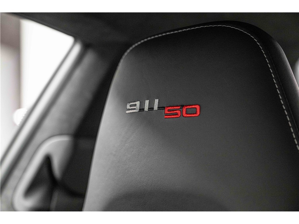 Coloris spécifique, jantes Fuchs 20’’, intérieur en cuir noir et tissu « Pepita », badges chromés « 911 50 », Pack Sport Chrono, échappement sport, PASM abaissé, et flat-6 de 400 ch couplé à la boîte PDK.