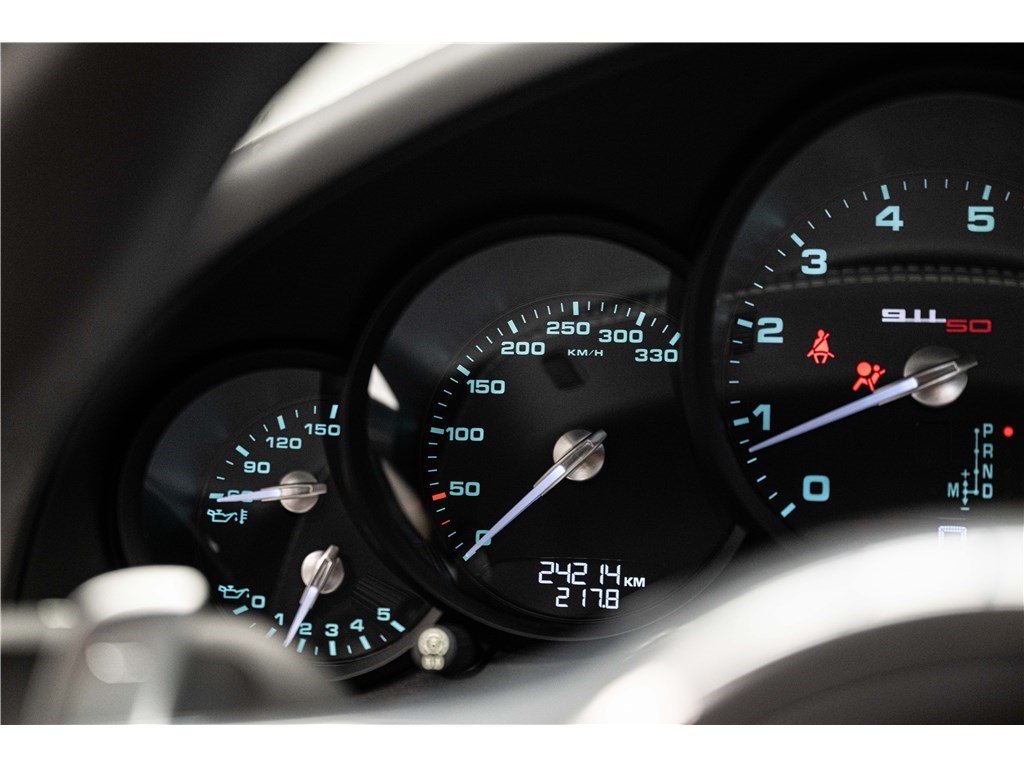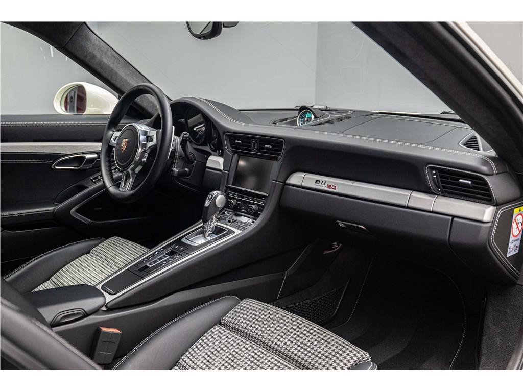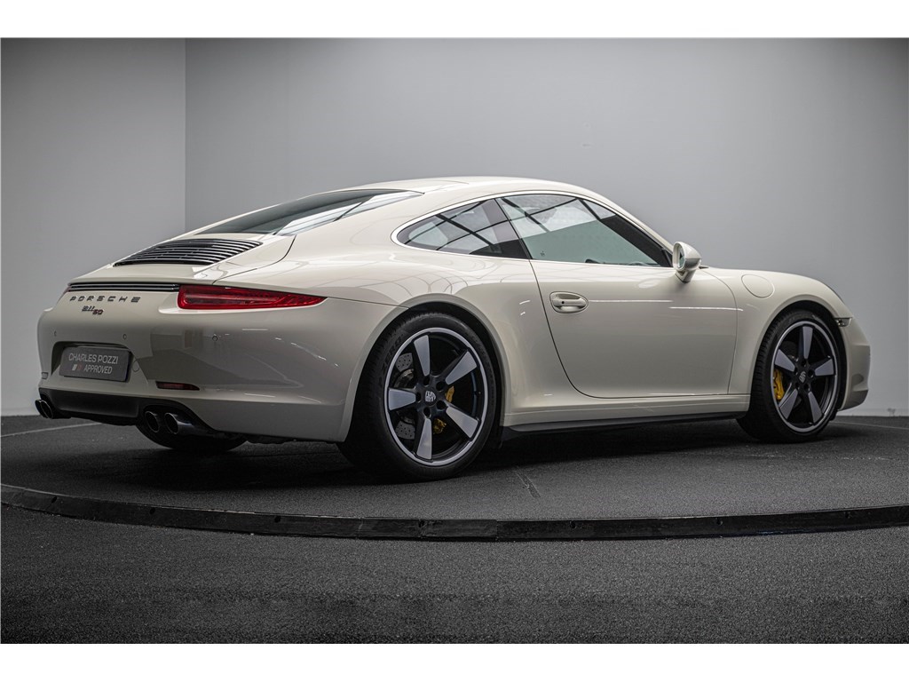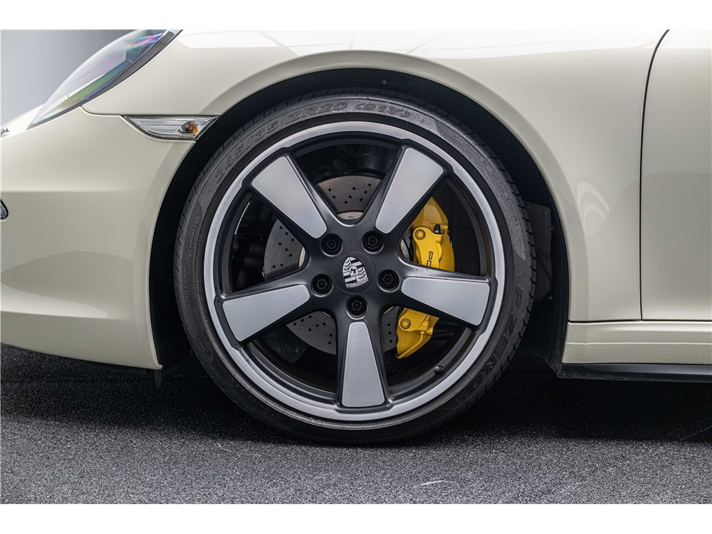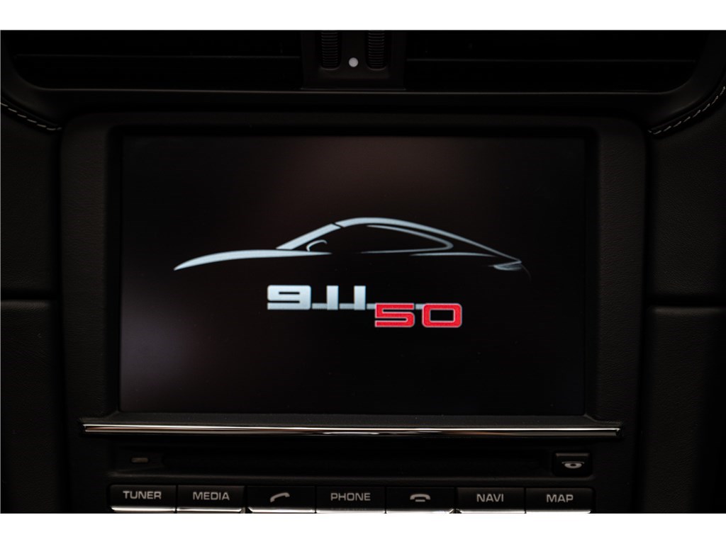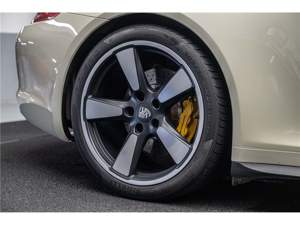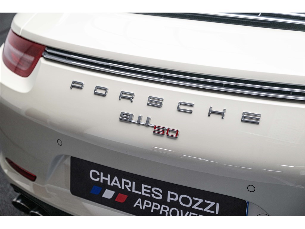 Coloris spécifique, jantes Fuchs 20’’, intérieur en cuir noir et tissu « Pepita », badges chromés « 911 50 », Pack Sport Chrono, échappement sport, PASM abaissé, et flat-6 de 400 ch couplé à la boîte PDK.