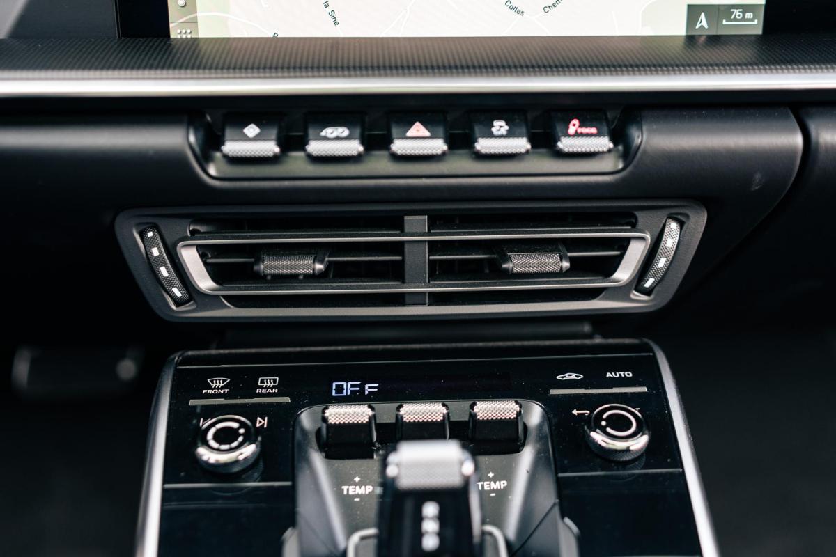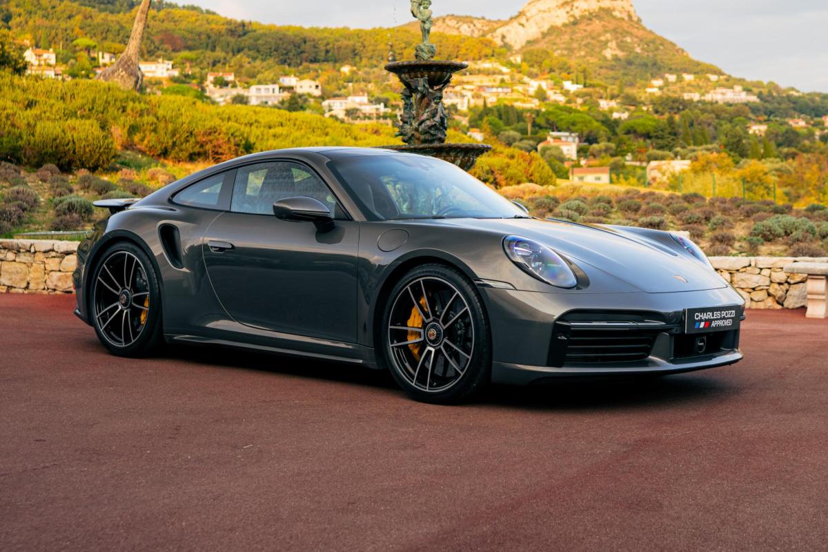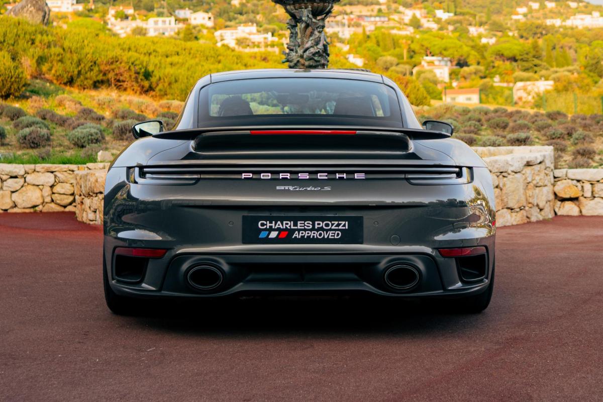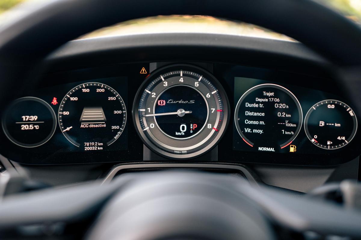 Cette configuration est très complète avec l’assistance parking 360°, le système audio Burmester High-End, le pack luminosité, les sièges avant chauffants et le châssis PASM abaissé de 10 mm. On retrouve aussi le régulateur adaptatif, les phares matriciels PDLS+ et l’échappement sport pour renforcer le caractère de cette Turbo S.