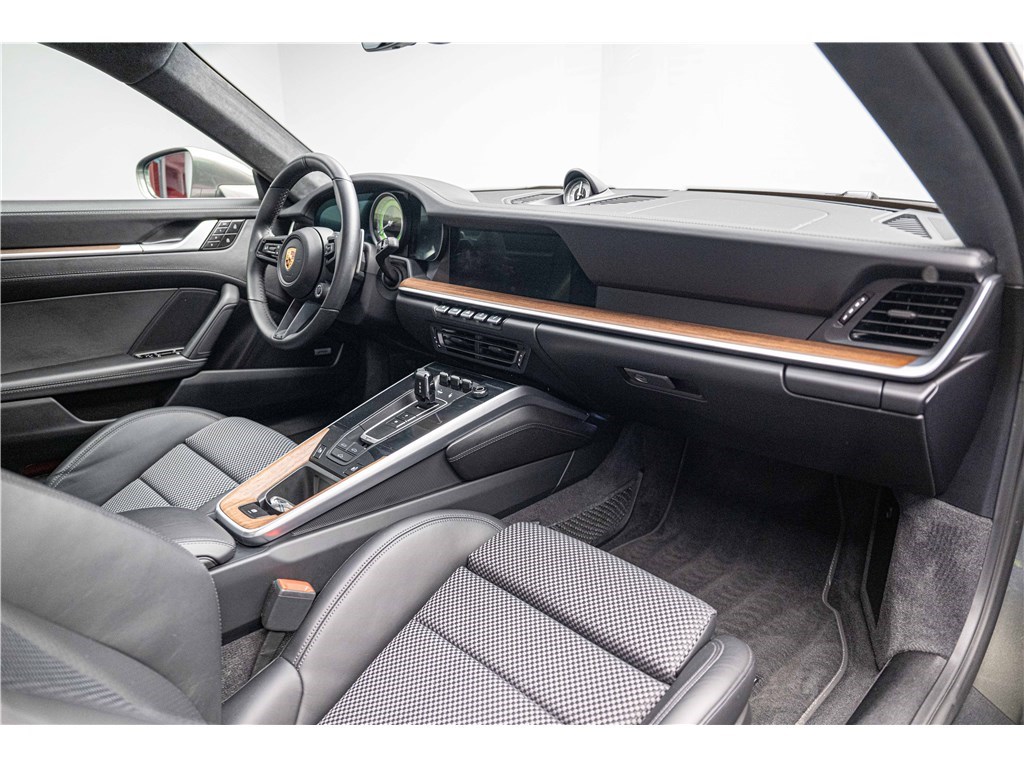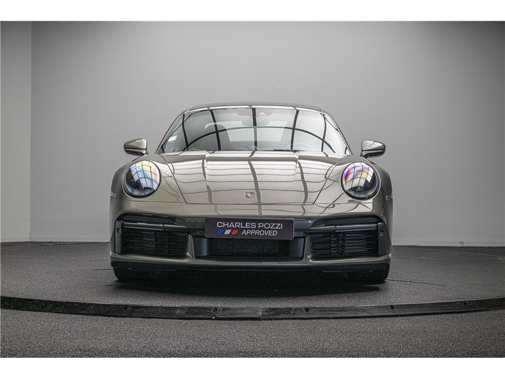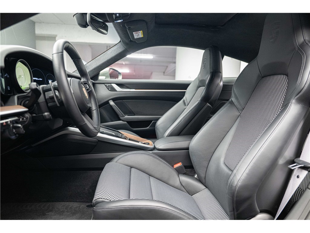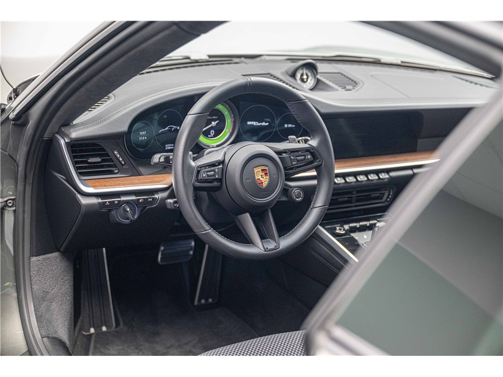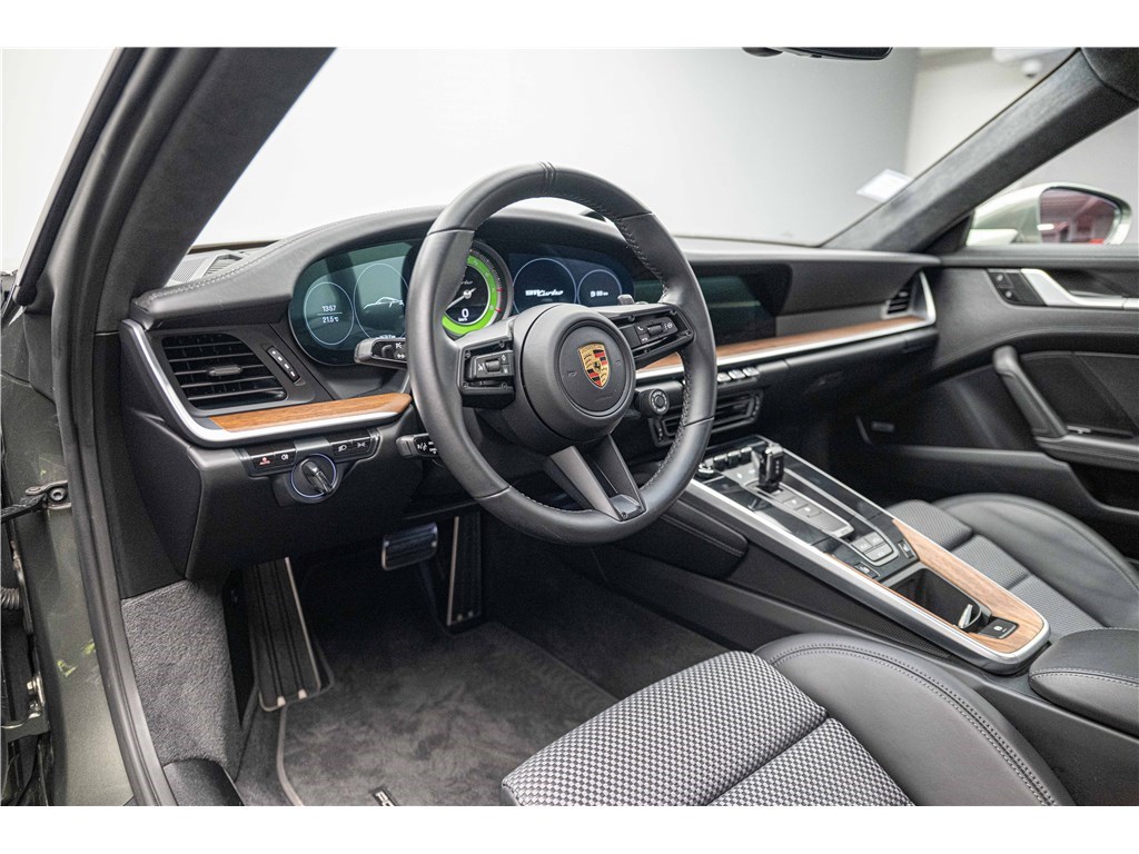 Porsche 911 Type 992 Coupé 3.8i 580 ch PDK (2021) avec 21 500 km. Ce modèle à la teinte Vert Aventurine métallisé et intérieur cuir/tissus Sport Tex noir offre un confort haut de gamme avec sièges sport adaptatifs électriques, chauffage, toit coulissant électrique et systèmes avancés comme PDLS+, PASM, PCCB et échappement sport noir. Garantie WTW 12 mois incluse. Disponible chez Charles Pozzi Paris, livraison partout en France.